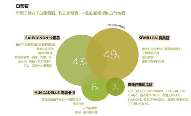 波尔多三大法定白葡萄品种:长相思(Sauvignon Blanc)、赛美蓉(Semillon)、密斯卡岱(Muscadelle)。