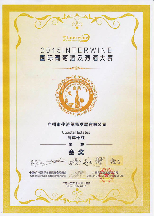 2015年 INTERWINE国际葡萄酒及烈酒大赛 金奖